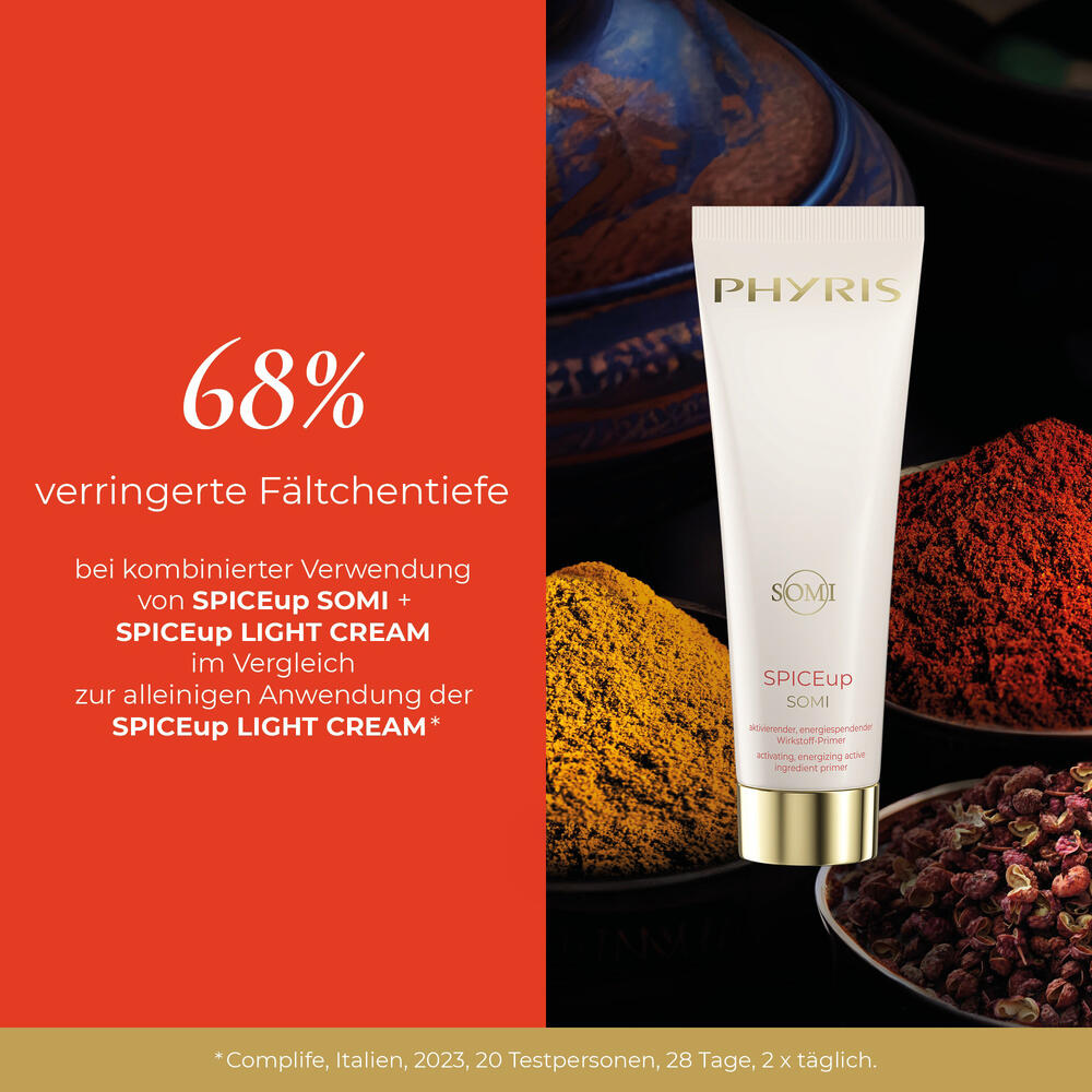 Energy. Activation. Primer - die geheimnisvolle Kraft der Gewürze! Der SOMI-Primer von PHYRIS macht den Anfang in der mystischen SPICEup Erlebniswelt: Als einzigartiger Wirkstoff-Primer bereitet es die Haut optimal vor, so dass die nachfolgenden SPICEup Pflegeprodukte ihre volle Wirkung entfalten, ein echter Wirkstoff-Booster also. Die leichte, erfrischende Formulierung durchfeuchtet die Haut und enthält nanosomal verkapseltes Coenzym Q10 mit Depot-Wirkung. Darüber hinaus schützt der Primer die Hautzellen, schenkt ihnen neue Energie und unterstützt die Regeneration. Für ein effektives Ergebnis auf der Haut.