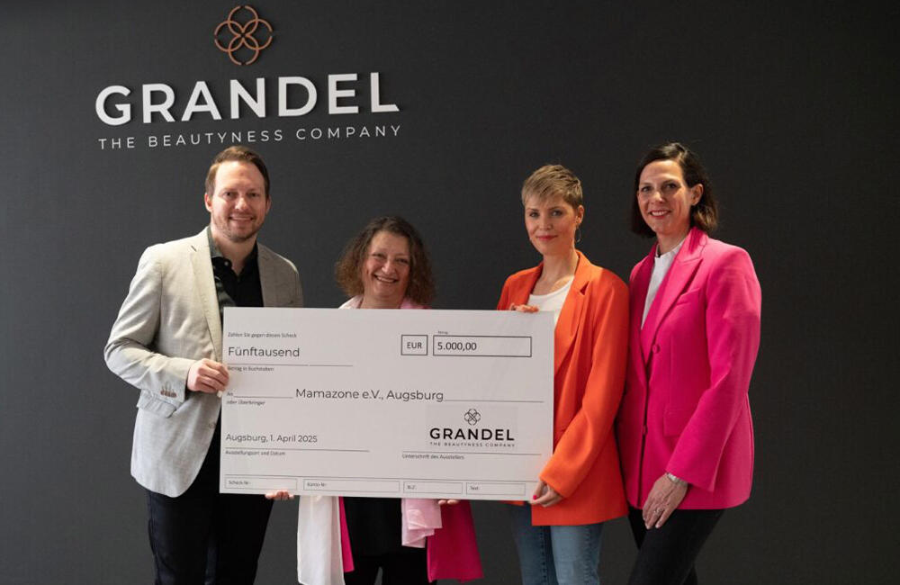Spendenübergabe 2025; v.l.n.r Dr. Gabriel Duttler, Geschäftsführung GRANDEL The Beautyness Company, Biggi Welter, Vorstand Mamazone e.Vl, Carolin Kotke, Bestseller-Autorin & Gesundheitsinfluencerin, Stefanie Franz, CMO und Mitglied der Unternehmensleitung GRANDEL The Beautyness Company
