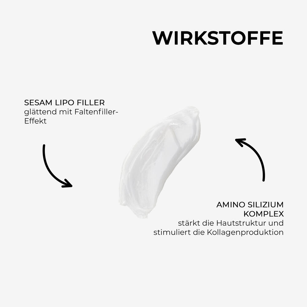 Öliger Sesamextrakt mit glättendem Faltenfiller-Effekt. Lässt die Haut deutlich ebenmäßiger erscheinen, indem er Linien, Falten und Knitterfältchen aufpolstert und die Hautfeuchtigkeit verbessert.