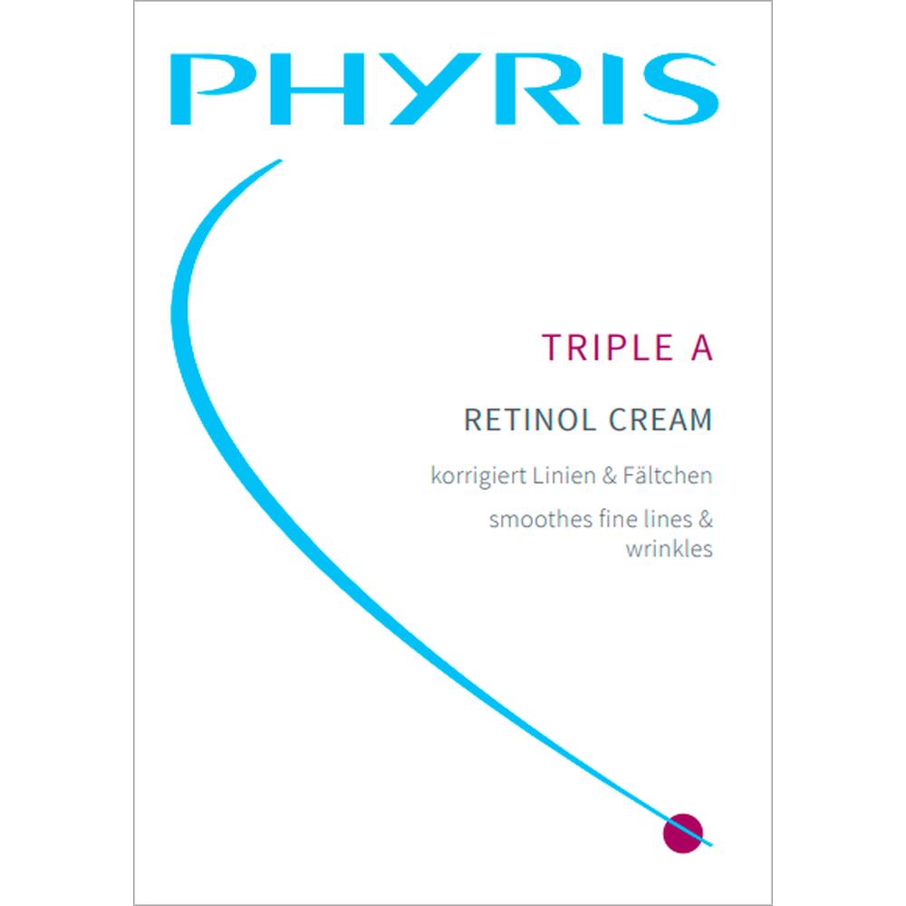 PHYRIS TRIPLE A Retinol Cream enthält die Wirkstoffe Vitamin A, klassisches Vitamin A und liposomal verkapseltes Retinol. Vitamin A wirkt der Fältchenbildung und bestehenden Fältchen effektiv entgegen. Das innovative Retinol Trio in der Gesichtscreme verbessert die Zellneubildung, die Elastizität der Haut und verfeinert das Hautrelief.